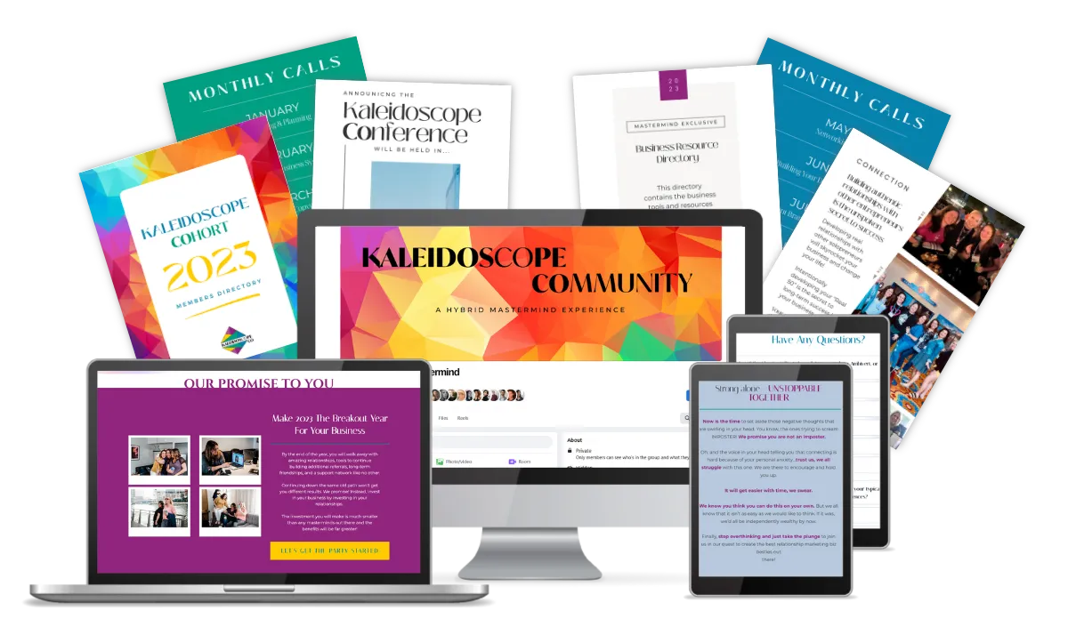 Kaleidoscope Co is a year-long mastermind experience that is designed to build your confidence, expand your referral connections, and create a biz bestie community to elevate your business and grow your income.